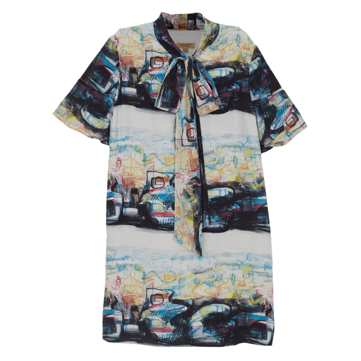 Detalhes: Modelo confeccionado em poliéster com estampa multicolorida. Possui modelagem chemise ampla, mangas curtas e gola com fita para amarração em laço.