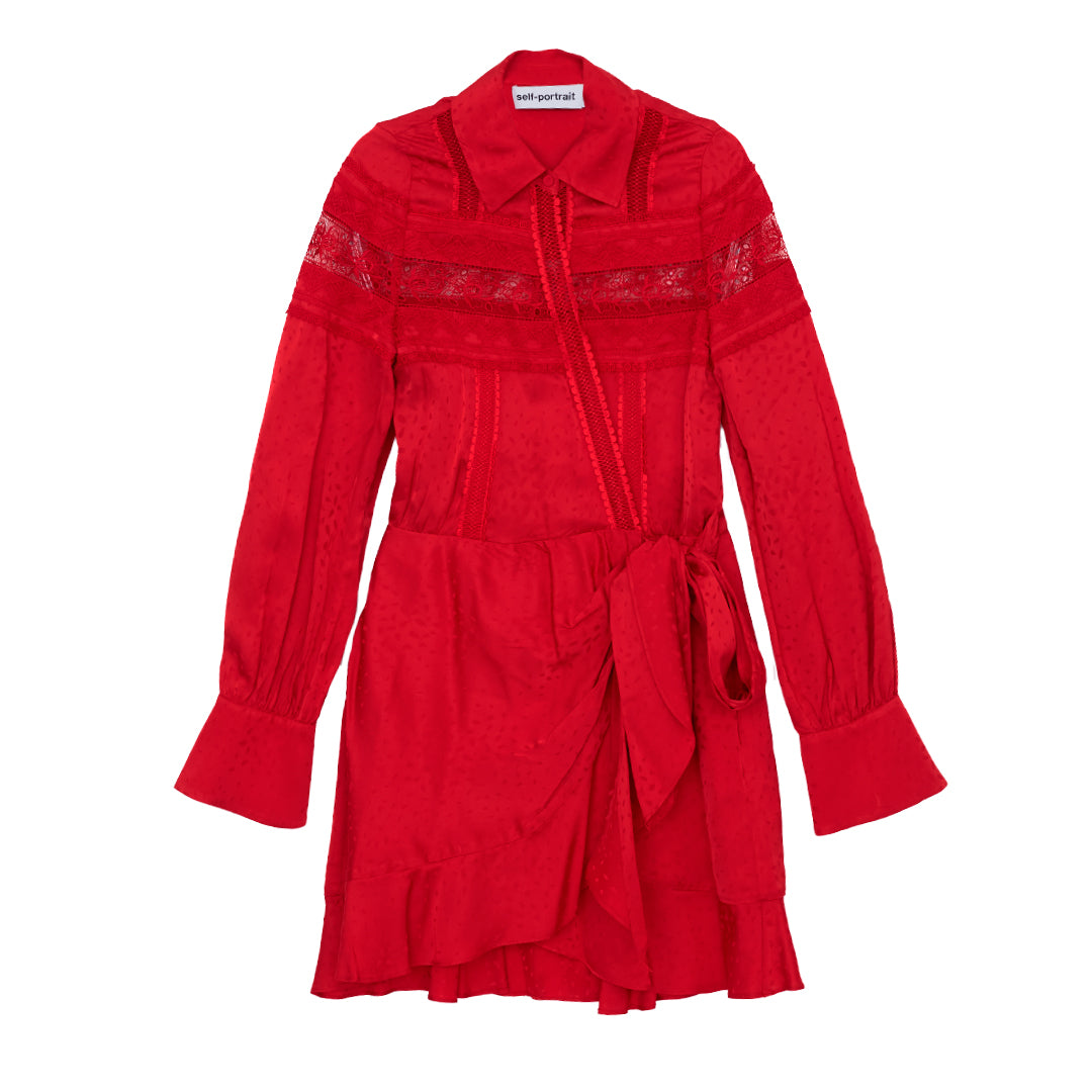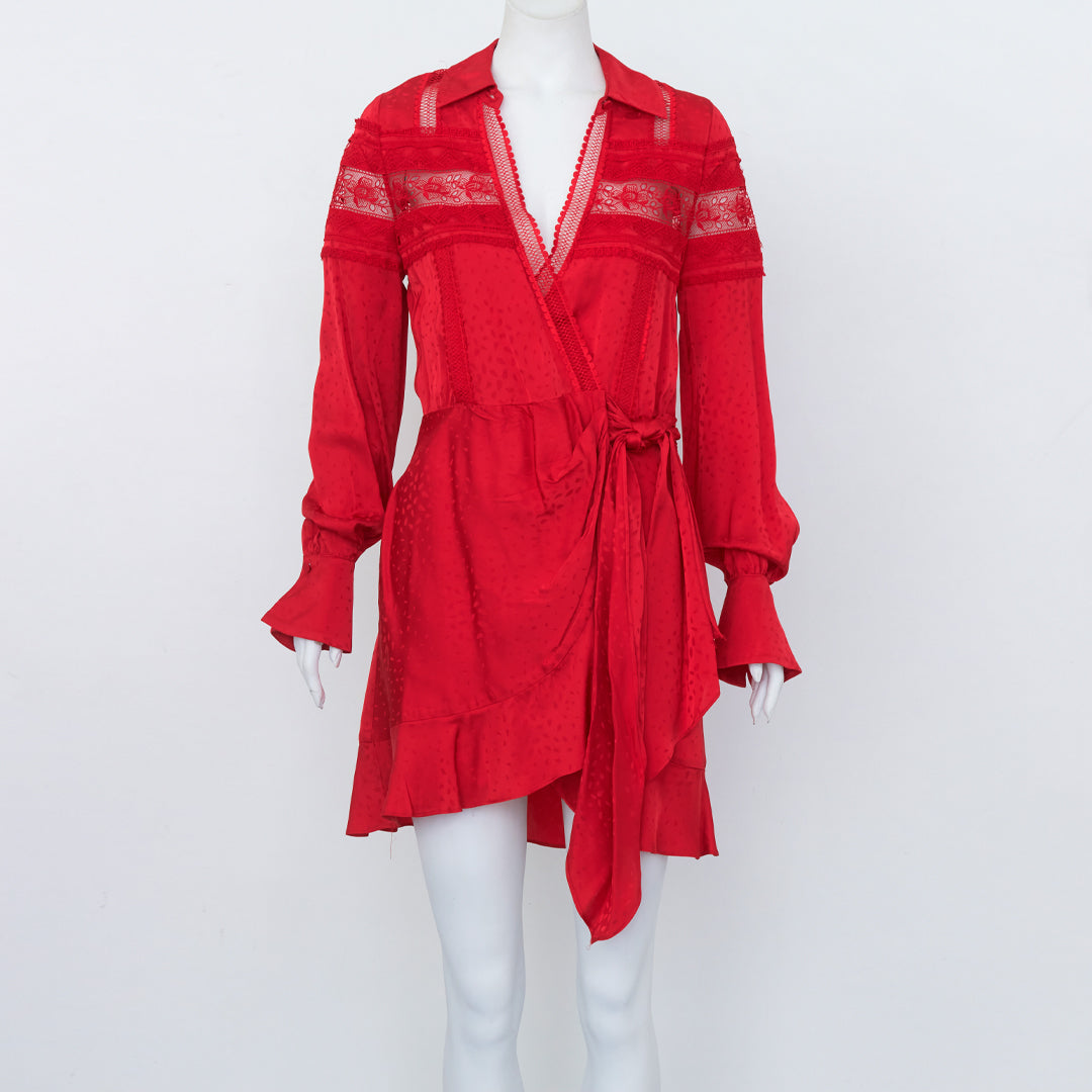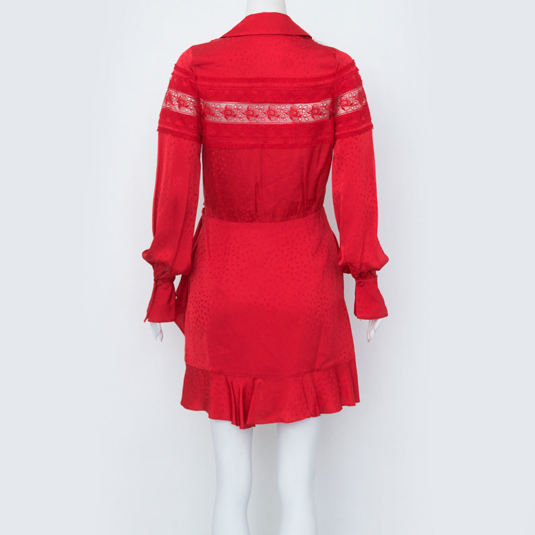 Detalhes: Vestido camisa Self-Portrait confeccionada em viscose na cor vermelha com aplicação de renda. Possui gola padre, mangas com punho flaire e botão. Saia envelope com fita lateral para amarração, aplicação de renda na área do busto,mangas e costas.