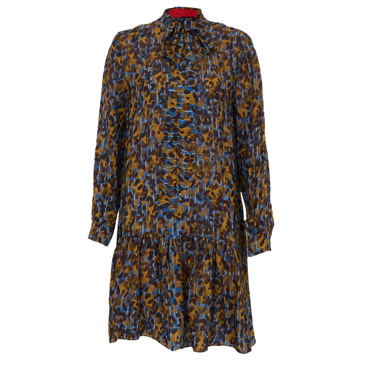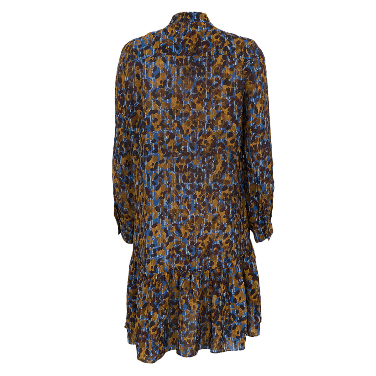 Detalhes: vestido carolina herrera, possui modelagem midi, mangas longas, gola rolê com amarração, estampa em marrom, ocre e azul.