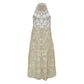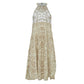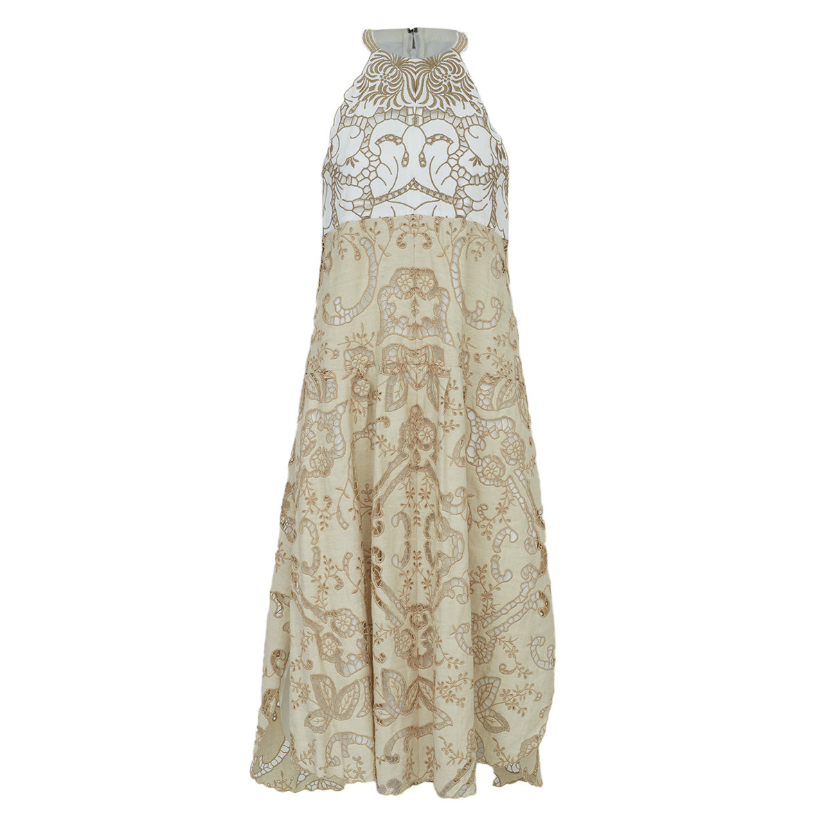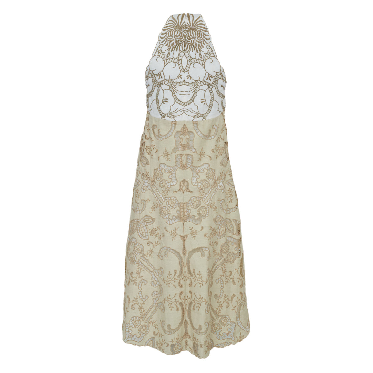 Detalhes: Modelo confeccionado em renda bege. Possui comprimento longo, vazados por toda a peça, gola alta, sem mangas, forro fixo e fecho por zíper traseiro.