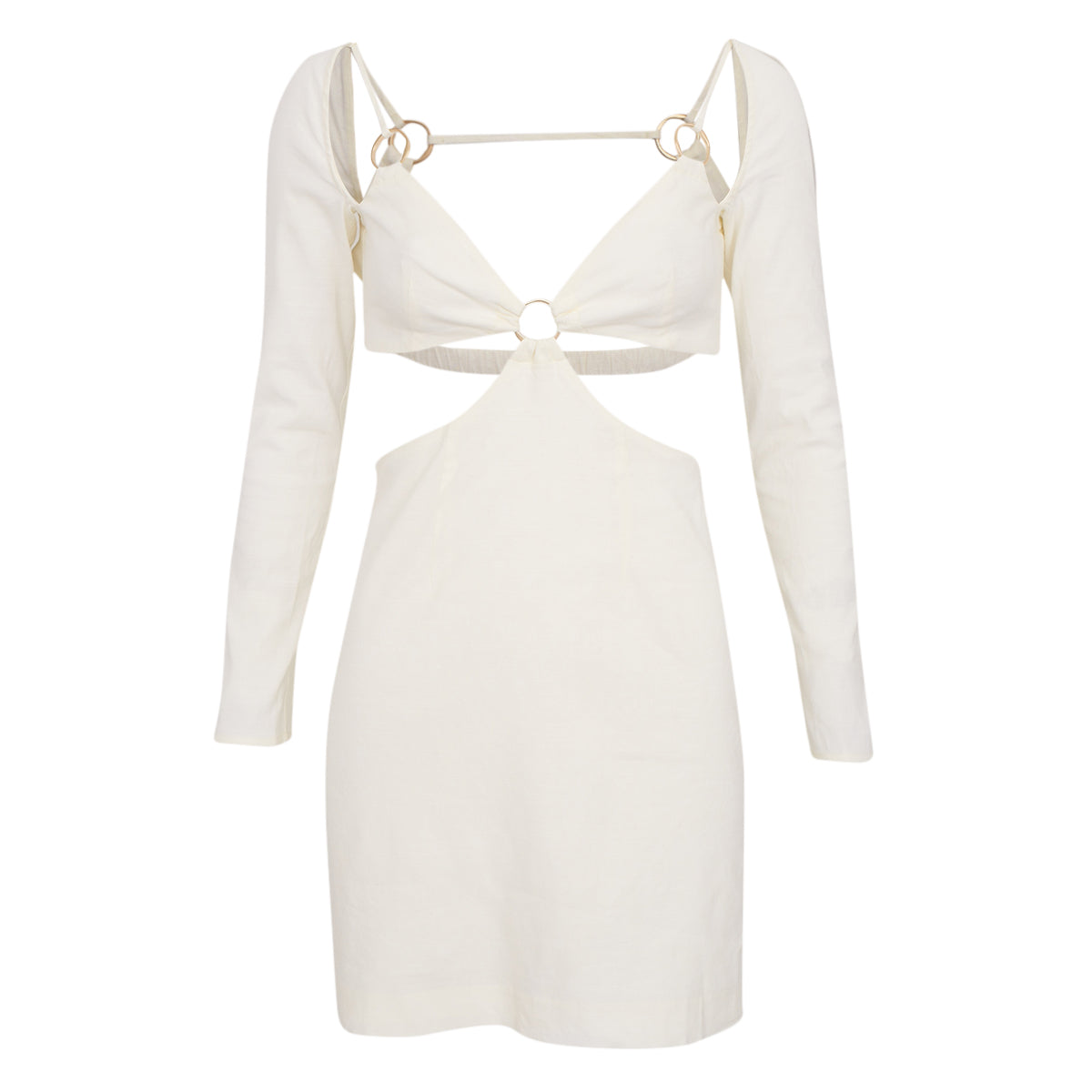 Vestido Cult Gaia Recortes Branco Tam. XS Produto: Vestido Marca: Cult Gaia Cores: Branco Material: 51% linho, 47% rayon, 2% elastano Detalhes: Vestido Cult Gaia branco, possui recortes na cintura, decote em V, mangas longas, comprimento curto. Estado da peça: usado, em excelente estado, sinais mínimos de uso. Tamanho: XS etiqueta.