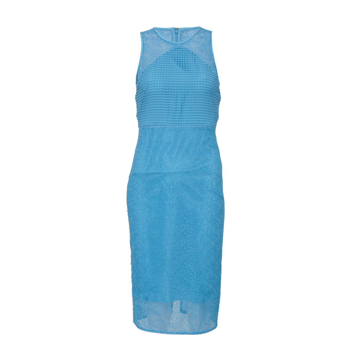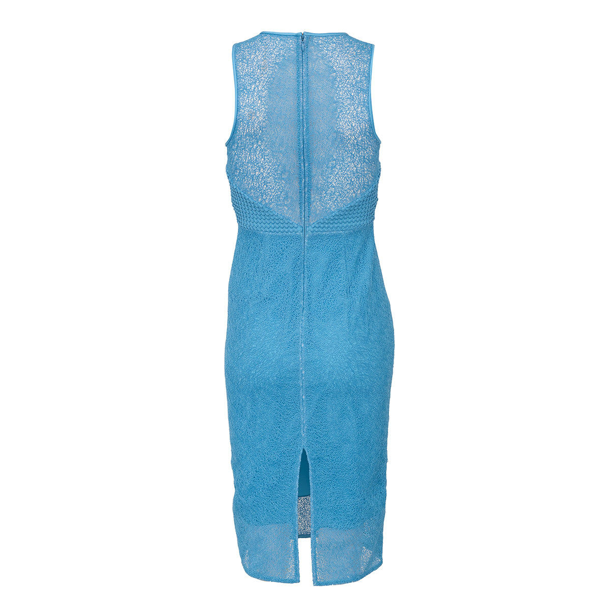 Detalhes: Vestido Diane Von Furstenberg azul, textura vazada com forro, modelagem lápis abaixo dos joelhos. Fecho em zíper na parte de trás na região do pescoço.