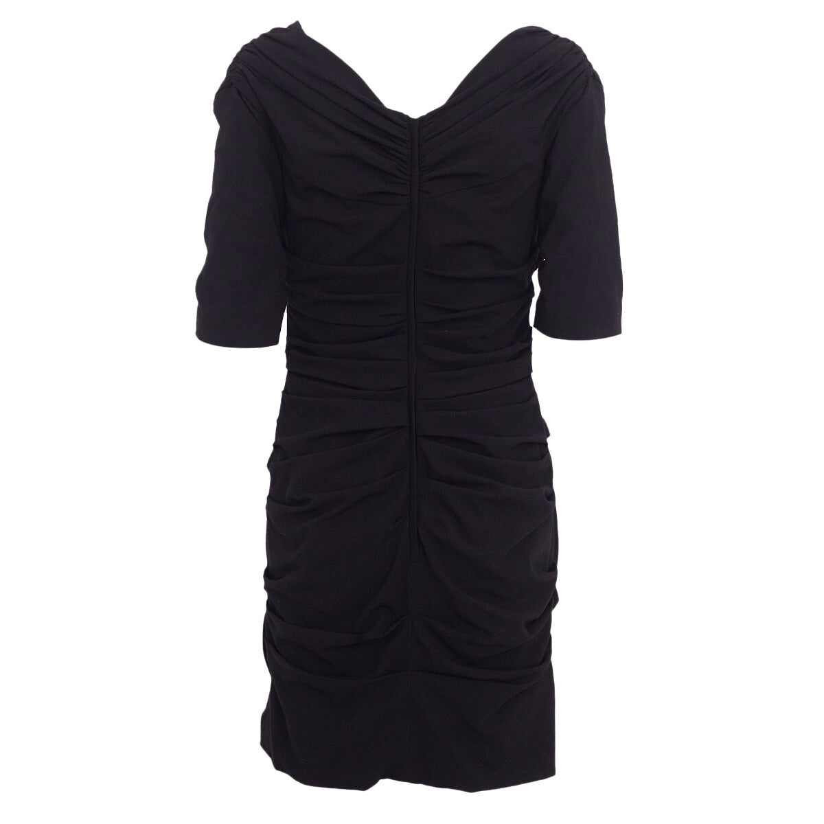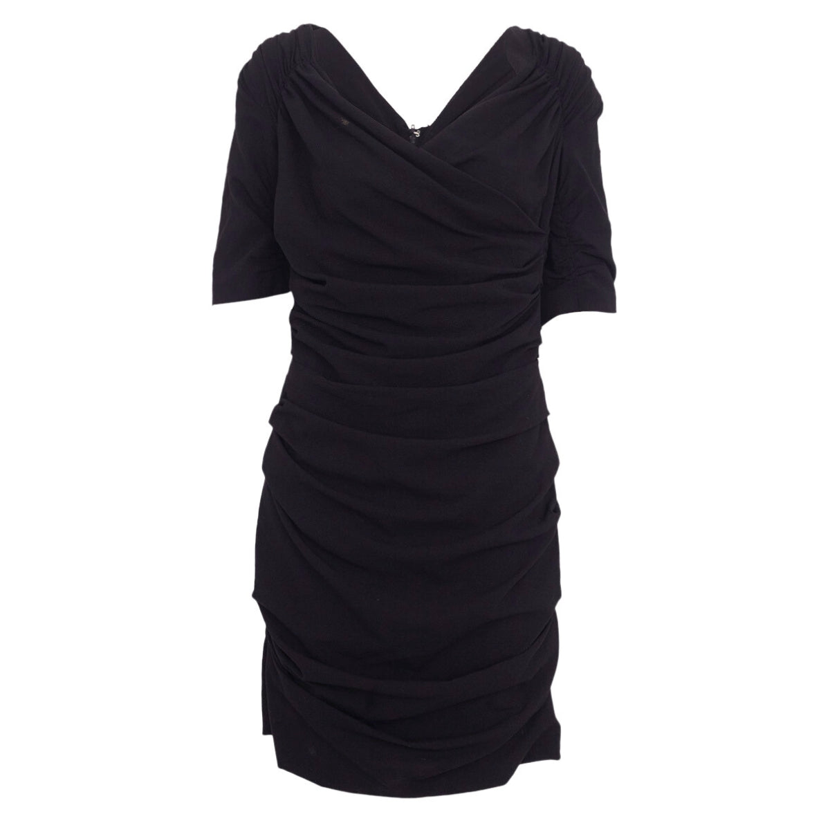 Detalhes: Modelo confeccionado em tecido preto. Possui comprimento médio, drapeados por toda a peça, decote em V, e mangas curtas. Contém fechamento posterior em zíper.