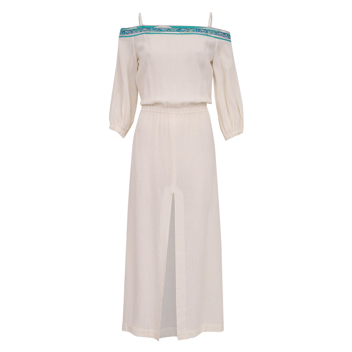 Detalhes: Vestido Emilio Pucci confeccionada em linho na cor off white. Modelo possui comprimento longo, alças finas, mangas longas, decote reto, recorte nos ombros, fenda frontal, elástico no punho e na cintura.