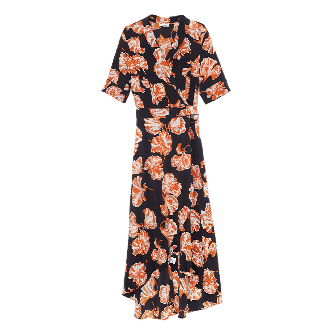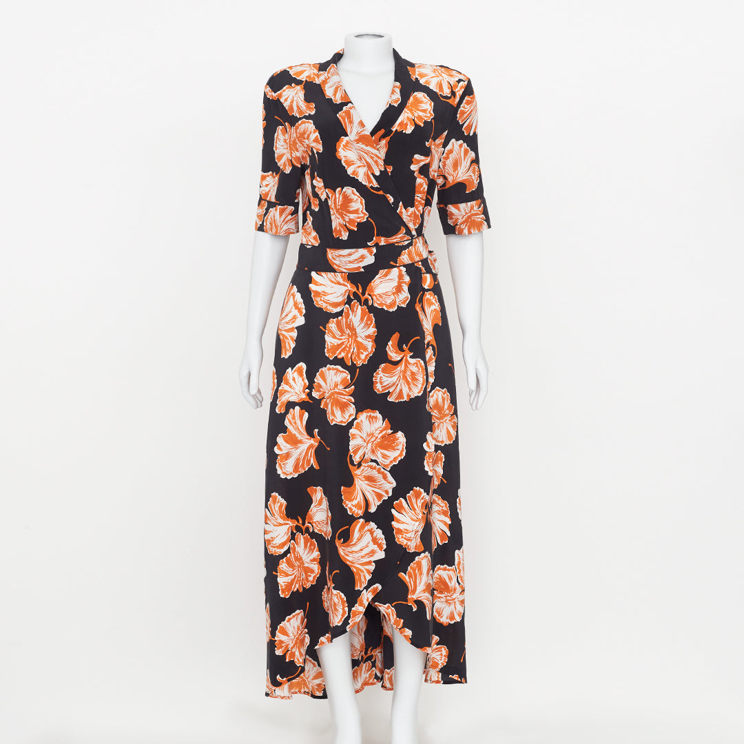 Detalhes: Vestido Johanna Ortiz em modelagem envelope com estampa floral na cor laranja e fundo cinza. Possui comprimento midi, gola padre, mangas curtas com punho . Saia ampla e fechamento em cinto aplicado a cintura para regulagem e botão de pressão aplicado ao busto.