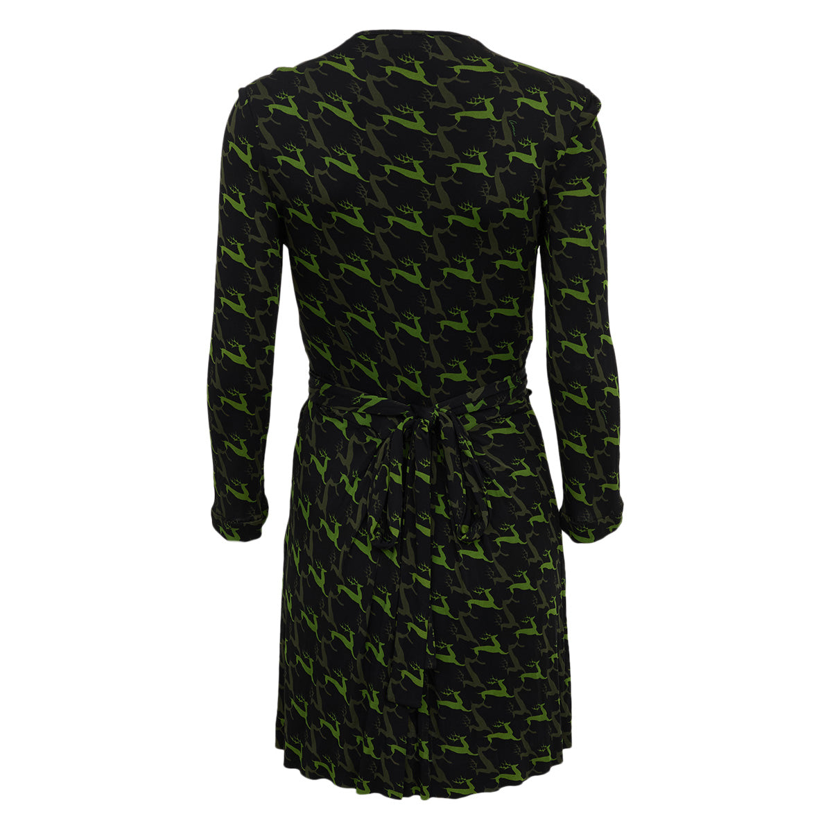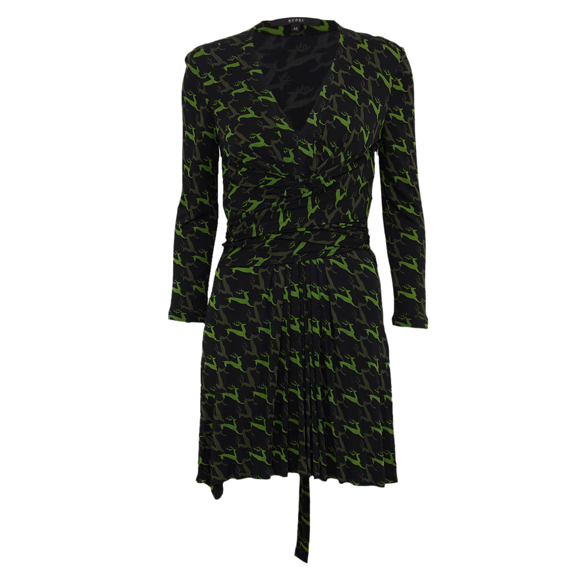 Detalhes: Vestido Gucci, possui modelagem curta, mangas longas, decote V e faixa para amarração.