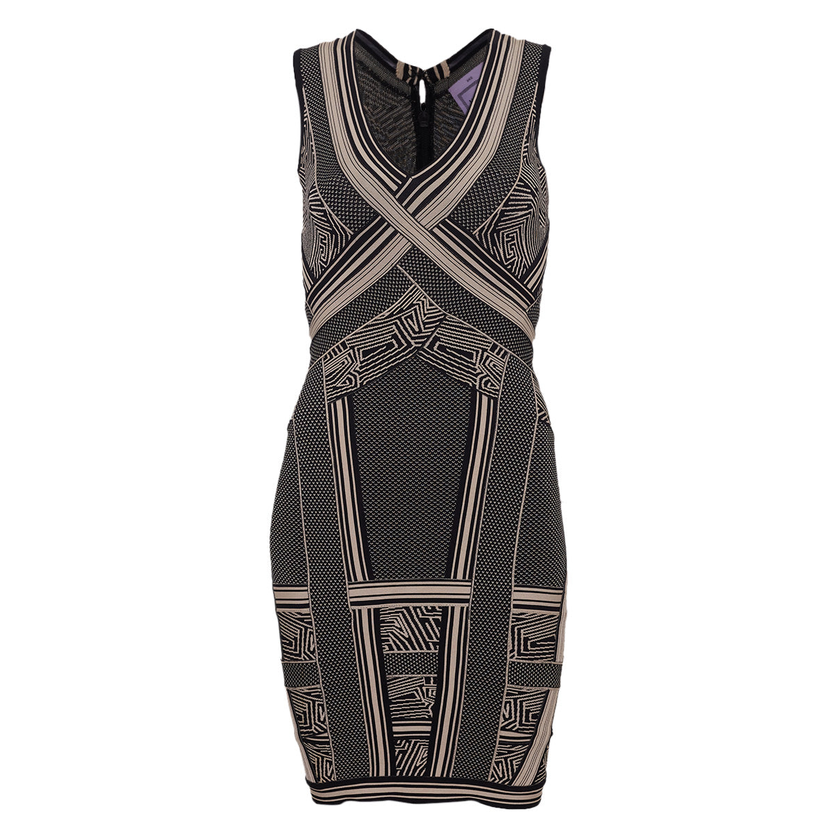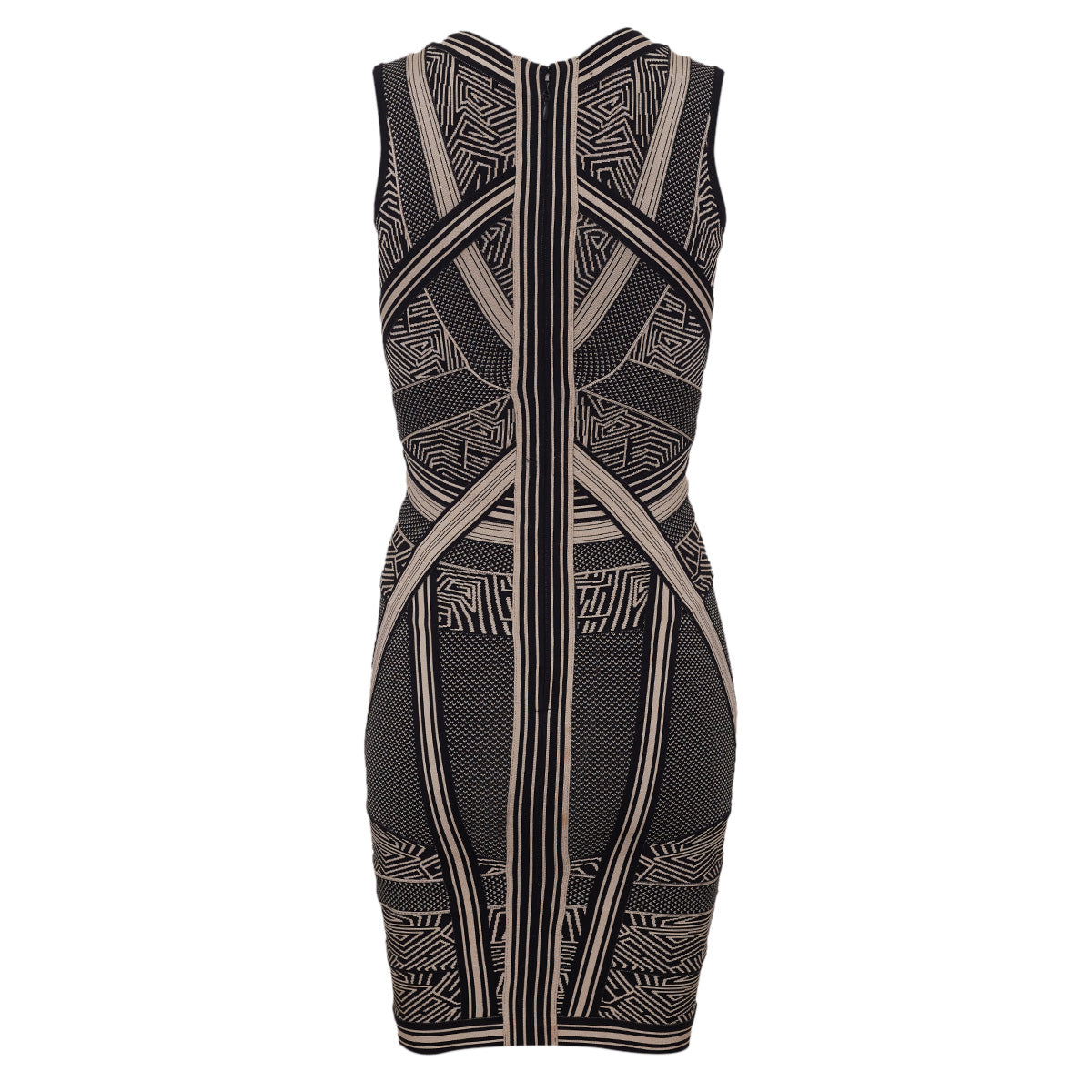 Detalhe: Vestido Herve Leger estampado nas cores preto e bege. Possui modelagem slim em bandagem, alças grossas que configuram um decote V e fechamento por ziper aplicado nas costas.