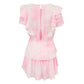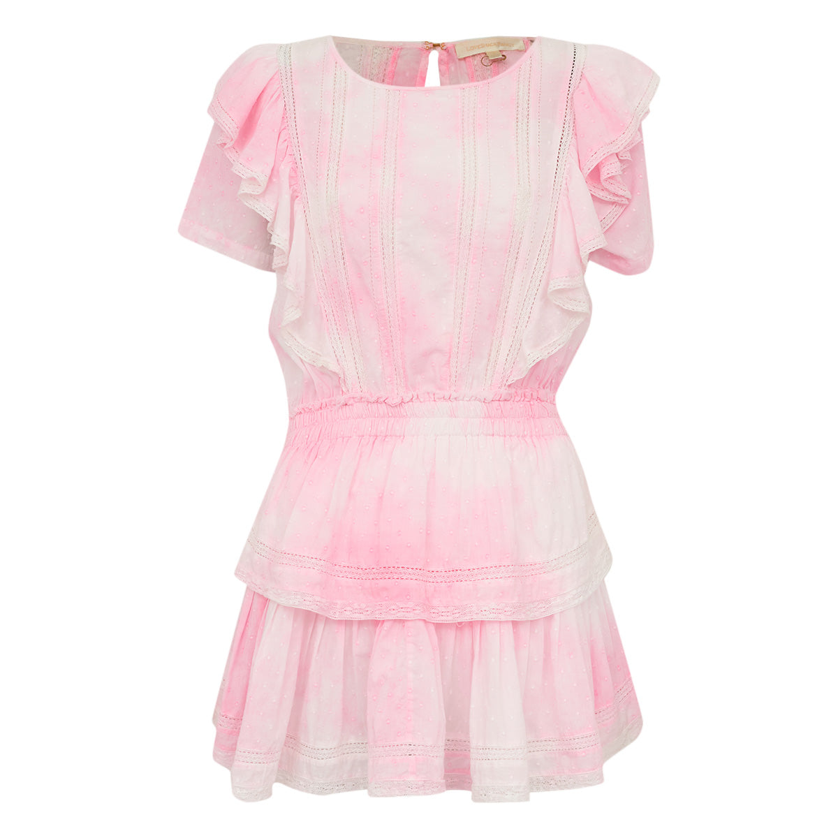 Detalhes: Vestido Love Shack Fancy confeccionado em algodão na cor rosa. Modelo apresenta modelagem curta, mangas curtas e babados. Possui elástico na cintura, coloração tie dye em rosa e branco.