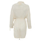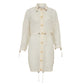 Detalhes: Vestido Paula Raia em seda off white transparente. O modelo possui mangas 3/4 com ajuste por elástico com metais nas pontas, gola colarinho, detalhes de elástico na cintura, barra e gola. Fechamento por botões frontais.