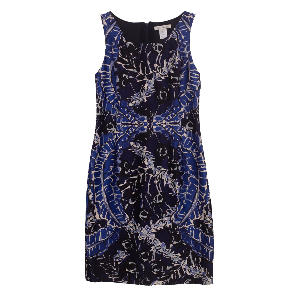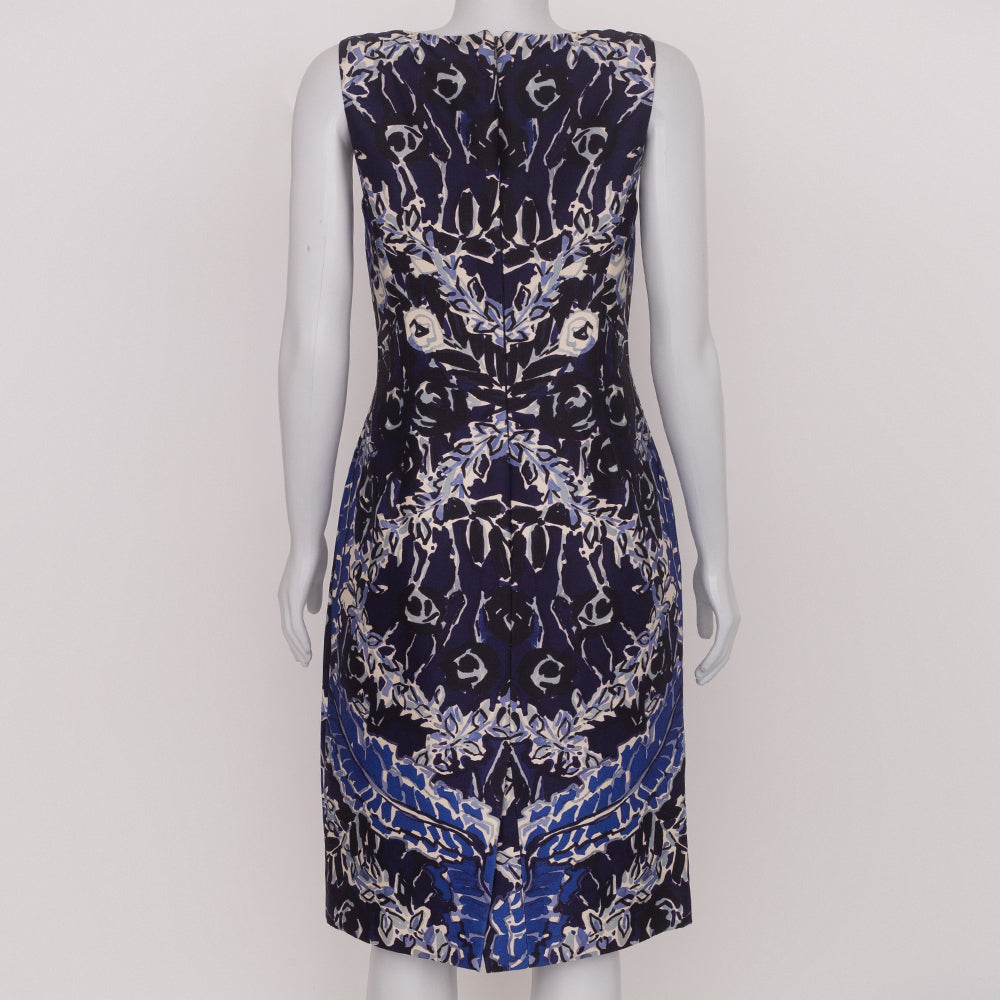 Detalhes: Vestido Oscar De La Renta confeccionado em seda e cotton com estampa abstrata em tons de azul. Em modelagem regular, decore redondo alto e sem alças. Saia reta, fechamento em ziper invisível aplicado as costas e fenda pequena. Estado: Usado, em otimo estado. Apresenta tecido e ziper em perfeito estado de conservação.