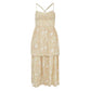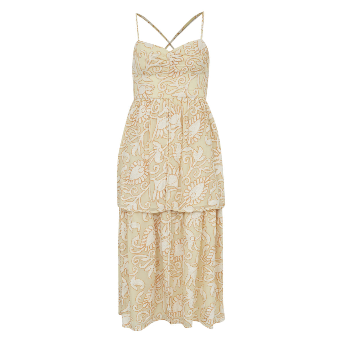 Detalhes: Vestido Paula Raia, confeccionado em viscose na cor amarelo, possui modelagem acinturada, bordados, babados no comprimento, e alças cruzadas. Detalhe de zíper lateral.