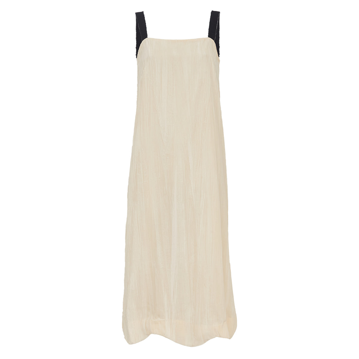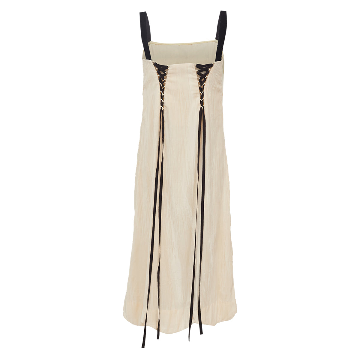 Detalhes: Vestido Paula Raia confeccionado em poliéster bege com fitas pretas. Possui comprimento médio, decotes retos, alças grossas, e detalhe de fitas entrelaçadas na parte traseira.