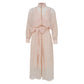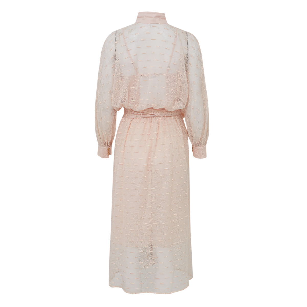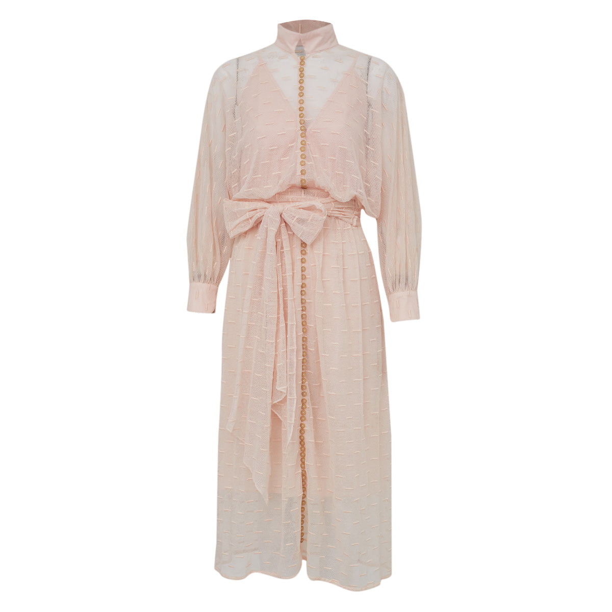 Detalhes: Vestido Paula Raia confeccionado em tecido vazado na cor rosa claro. Modelo possui comprimento longo, mangas longas com botões e gola alta. Acompanha forro fixo e cinto para amarração. Fechamento por botões frontais.