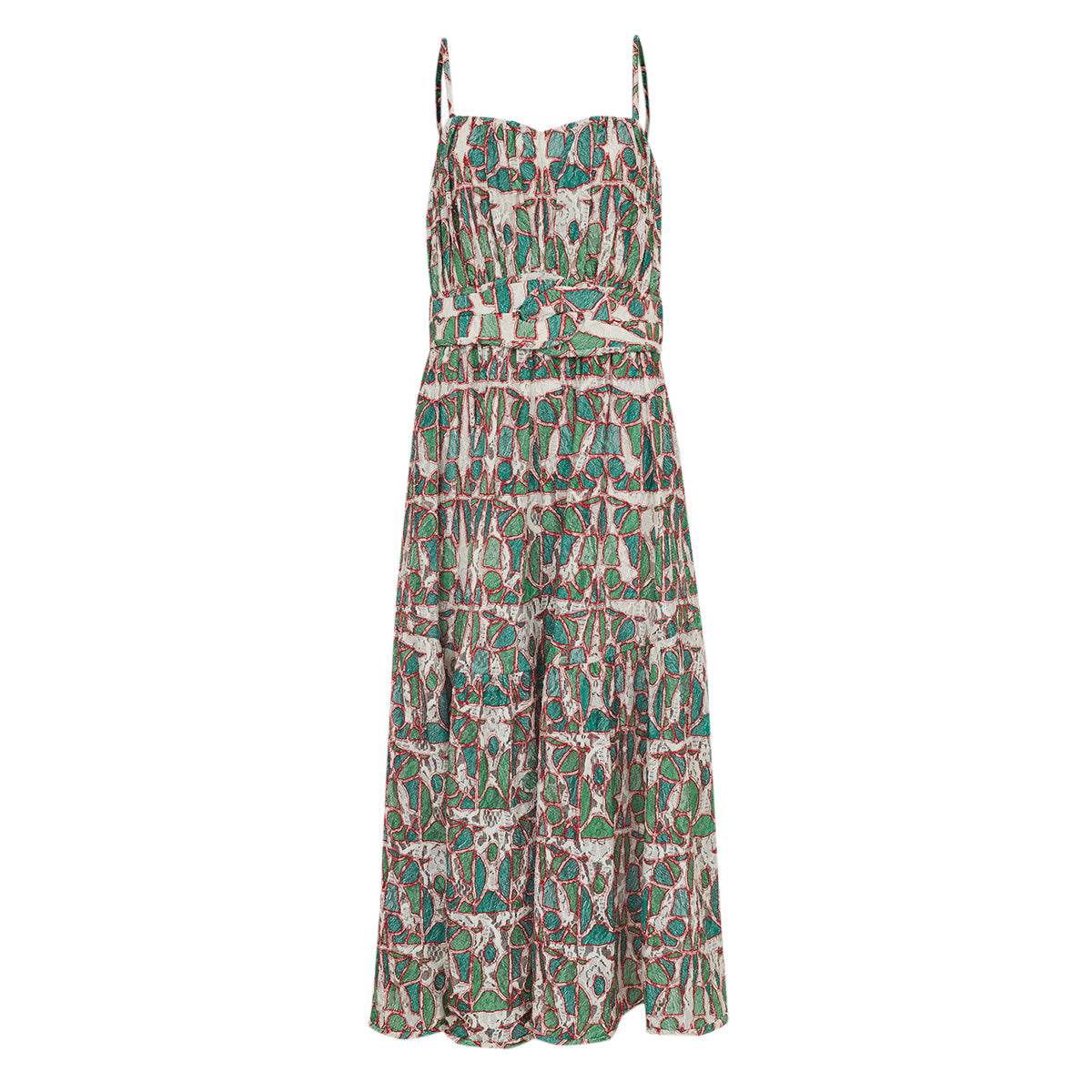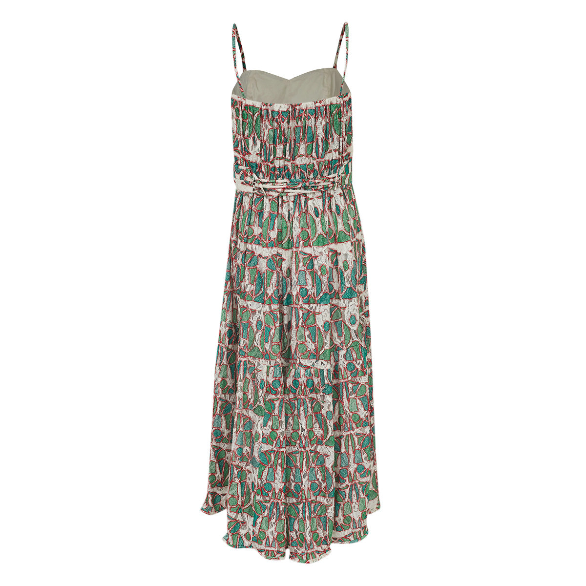 Detalhes: Vestido Paula Raia confeccionado em tecido estampado nas cores verde e vermelho. Possui comprimento longo, decote coração, alças finas e saia rodada. Acompanha cinto. Fecho por zíper lateral.