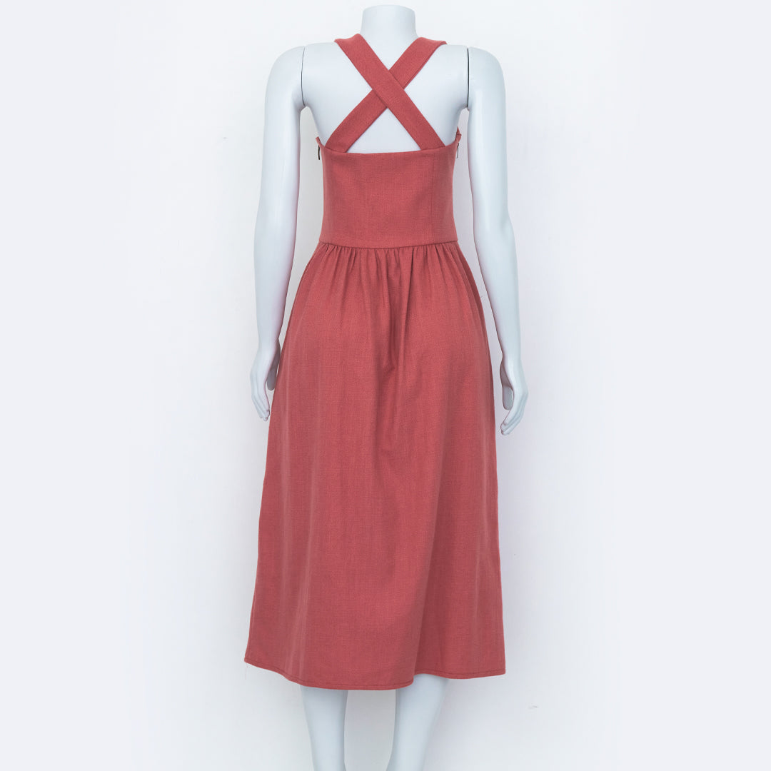 Detalhe: Vestido Paula Raia com recorte frontal na cor goiaba. Possui coração alto, alças grossas com efeito cruzado nas costas, recorte triangular localizado na área da cintura. Saia em modelo evasê levemente rodado. Fechamento em ziper inserido na lateral.
