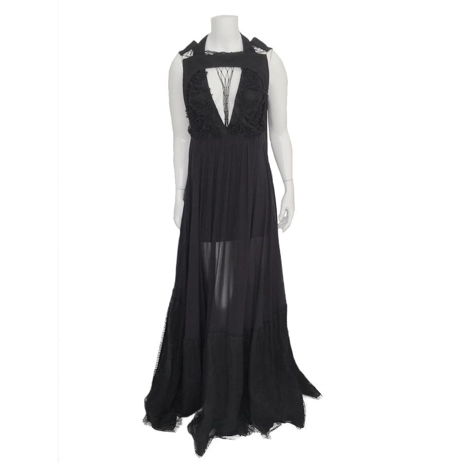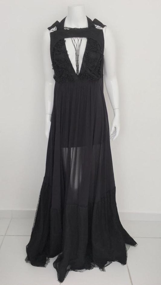 Vestido Paula Raia Preto Macramê e Bordados Tam. 38