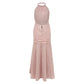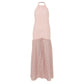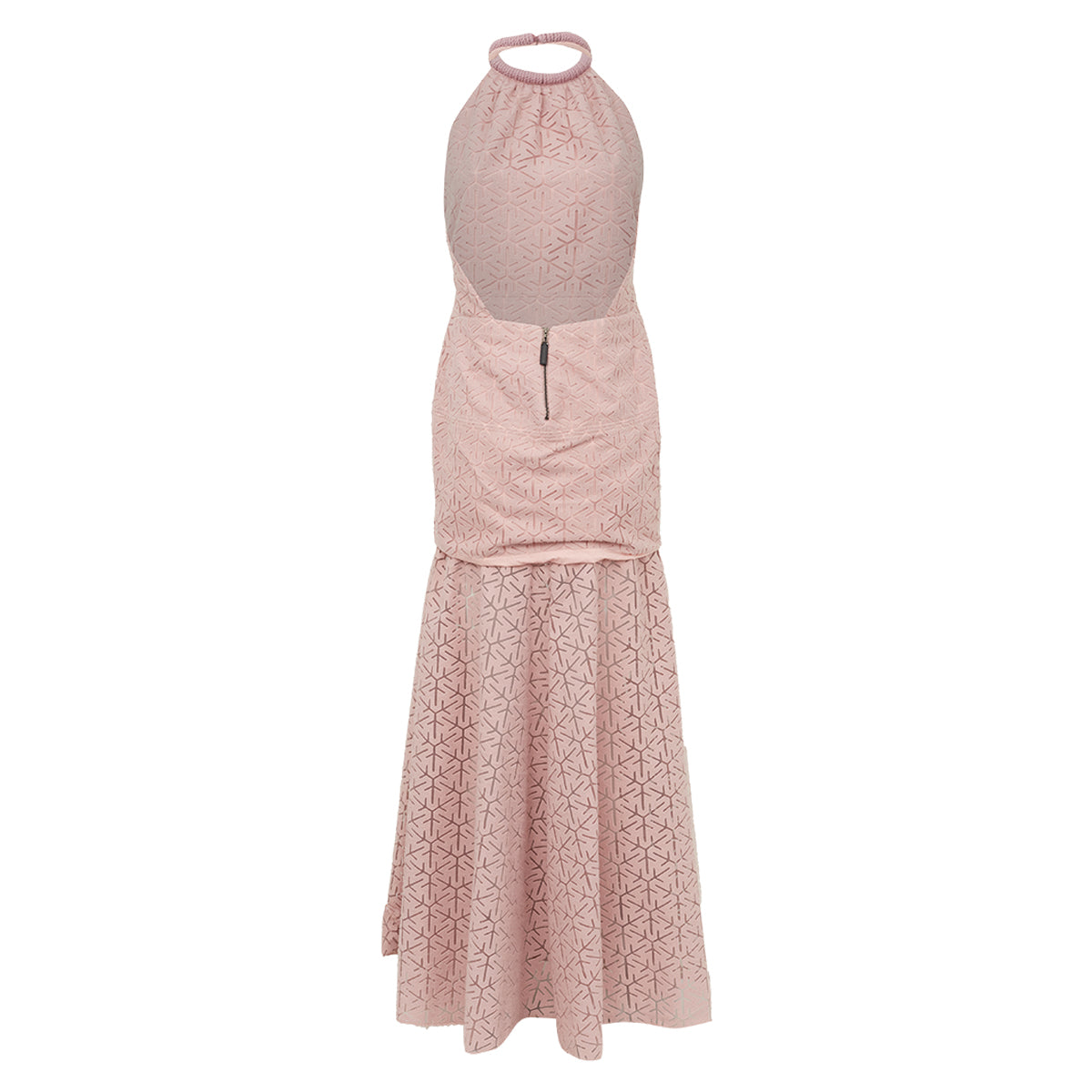 Detalhes: Vestido Paula Raia confeccionado em tecido cor de rosa bordado. Modelo possui comprimento longo, costas nuas, ajustado na cintura e caimento rodado na saia com transparência nas pernas. Fechamento em colchetes no pescoço e zíper na parte traseira.