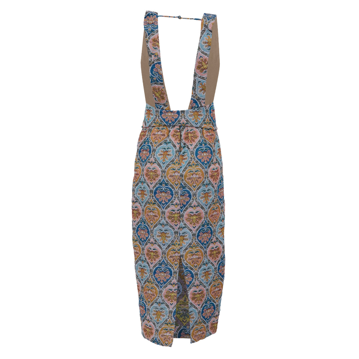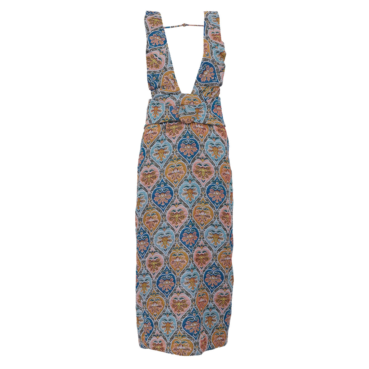 Detalhes: O Conjunto é longo e estampado com um padrão colorido que remete a mandalas, paisley ou azulejos portugueses. As cores predominantes na estampa são rosa, azul claro, azul escuro, amarelo e bege. Ele tem um decote em V profundo e a saia é reta e longa. A parte superior do vestido apresenta babados nas alças e na linha do busto, com um detalhe franzido na cintura que realça a silhueta.