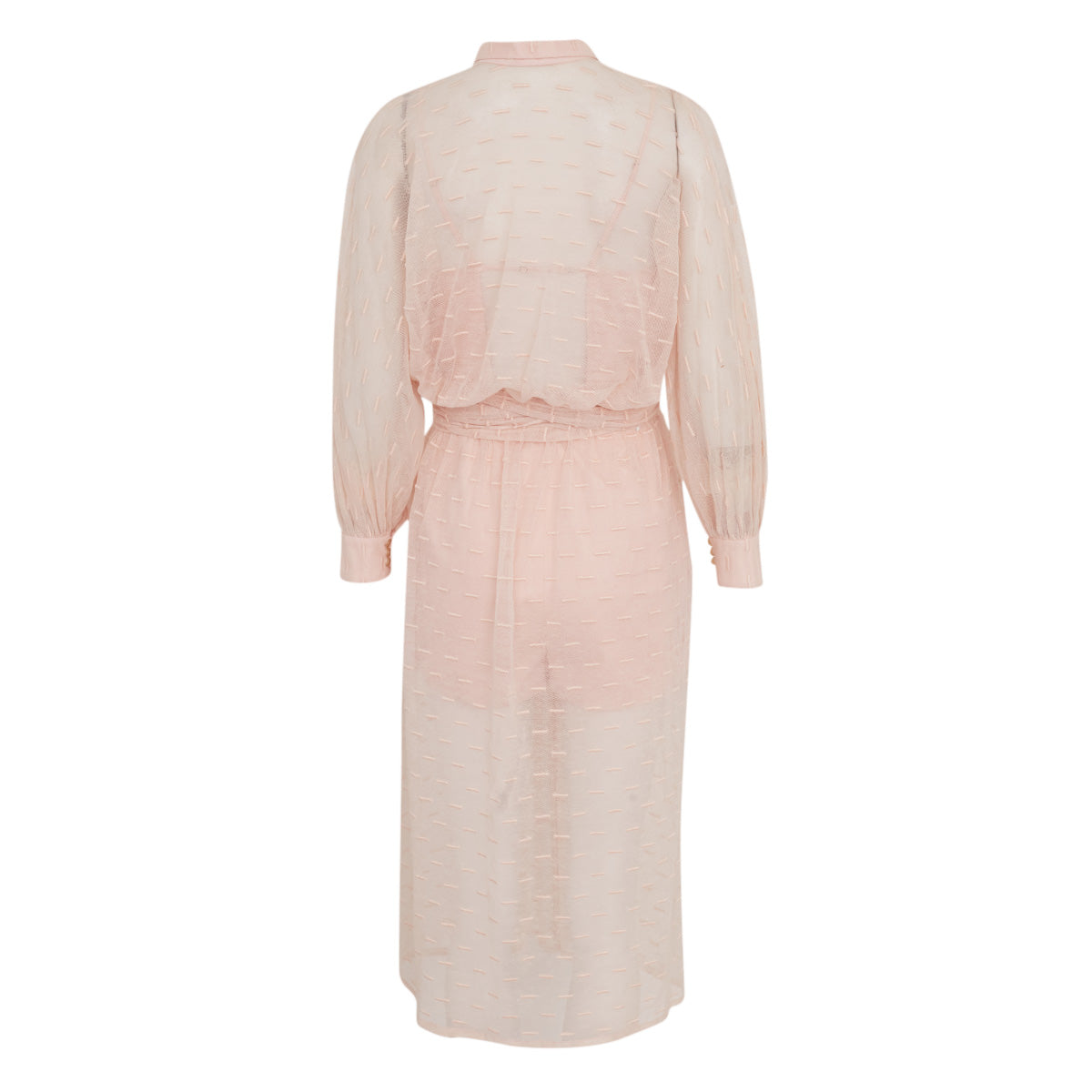 Detalhes: Vestido Paula Raia confeccionado em tule na cor rosa bebê. Possui mangas compridas, decote redondo, comprimento longo, punho com botões, dois bolsos laterais e faixa para a cinturar. Acompanha short em algodão para forro, conta com dois zíperes laterais e elástico posterior no cós. Fechamento frontal por botão.