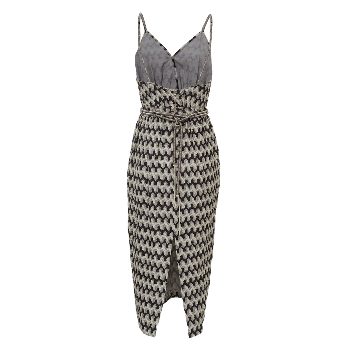 Detalhes: Vestido Paula Raia confeccionado em linho estampado em tons de verde. Possui comprimento logo, decotes em V, alças finas com detalhes em metal e fenda traseira. Fechamento por zíper traseiro. Acompanha cinto de metal para amarração.