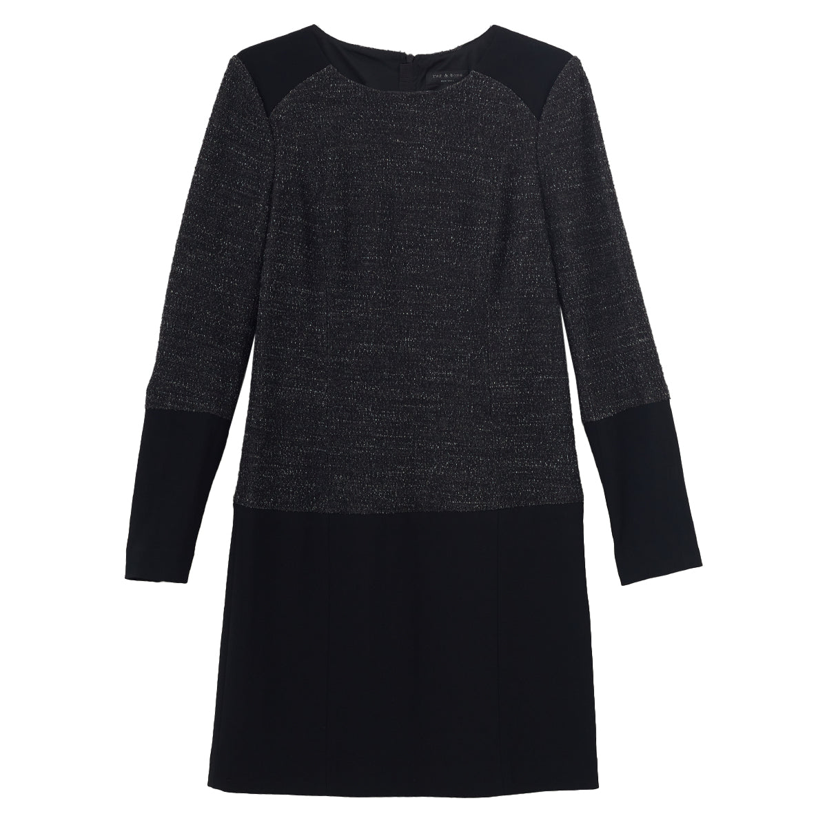 Detalhes: Modelo confeccionado em tecido levemente texturizado e mesclado em preto e branco na parte superior. Parte inferior em tecido preto. Conta com gola arredondada, comprimento curto, mangas compridas e fecho por zíper posterior.