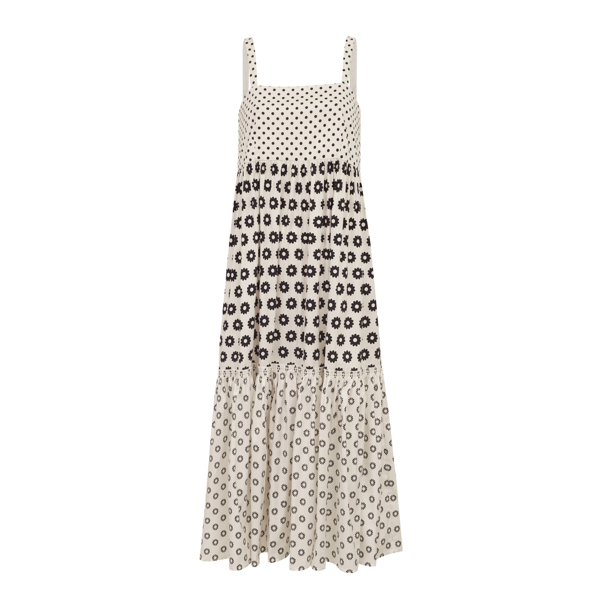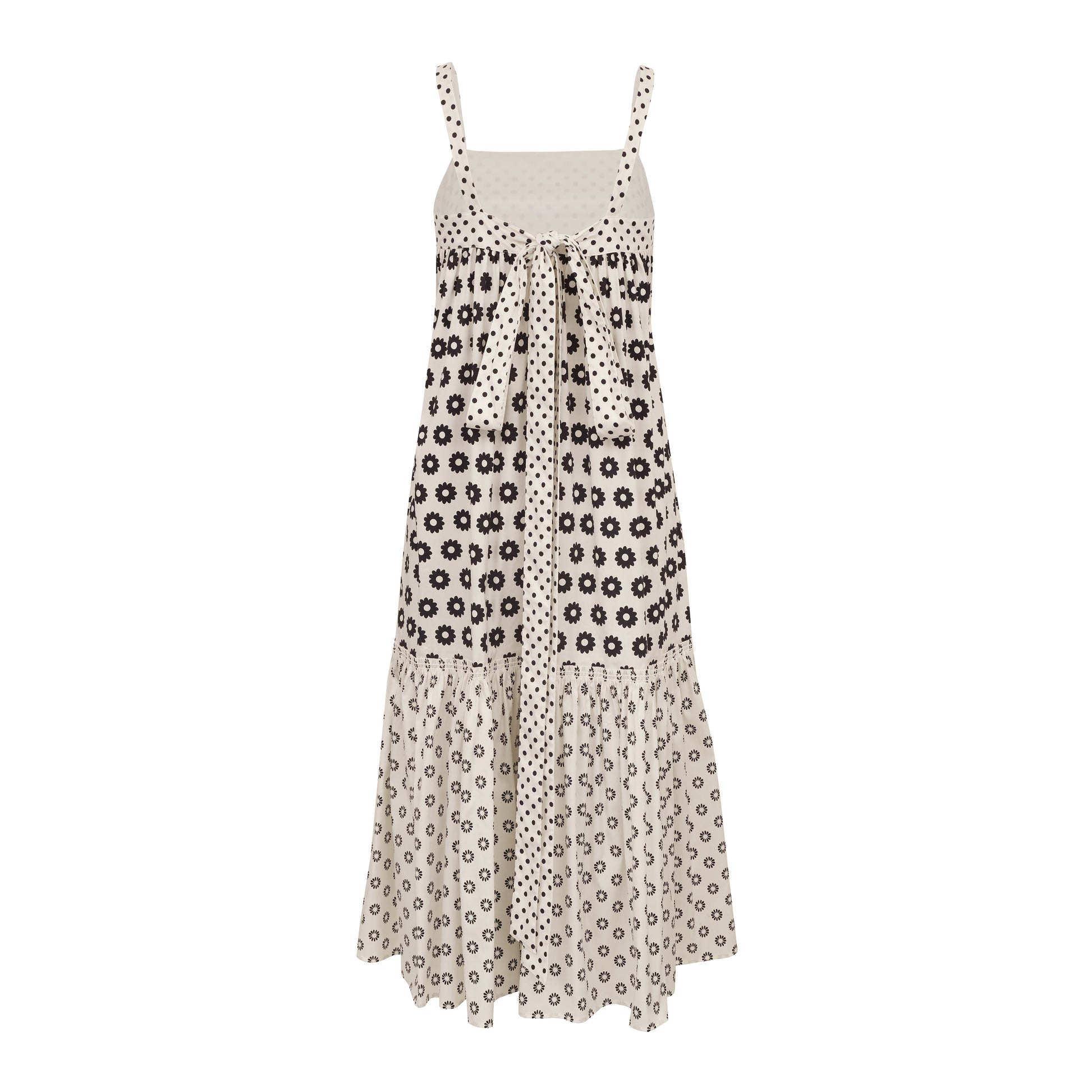 Detalhes: Vestido confeccionado em algodão estampado floral, modelagem balonê, comprimento longo, alças grossas, gola reta e fitas para amarração na parte traseira.