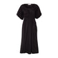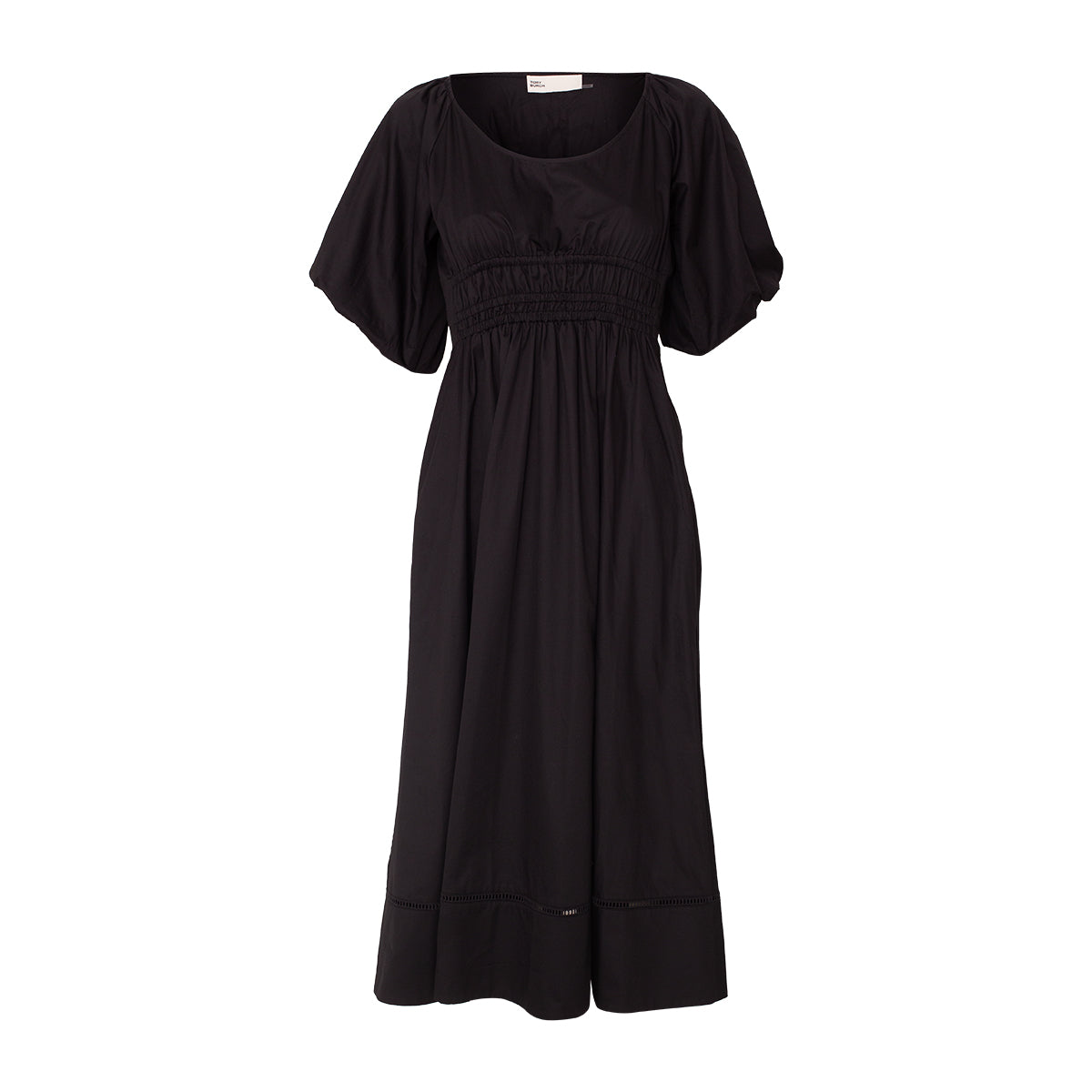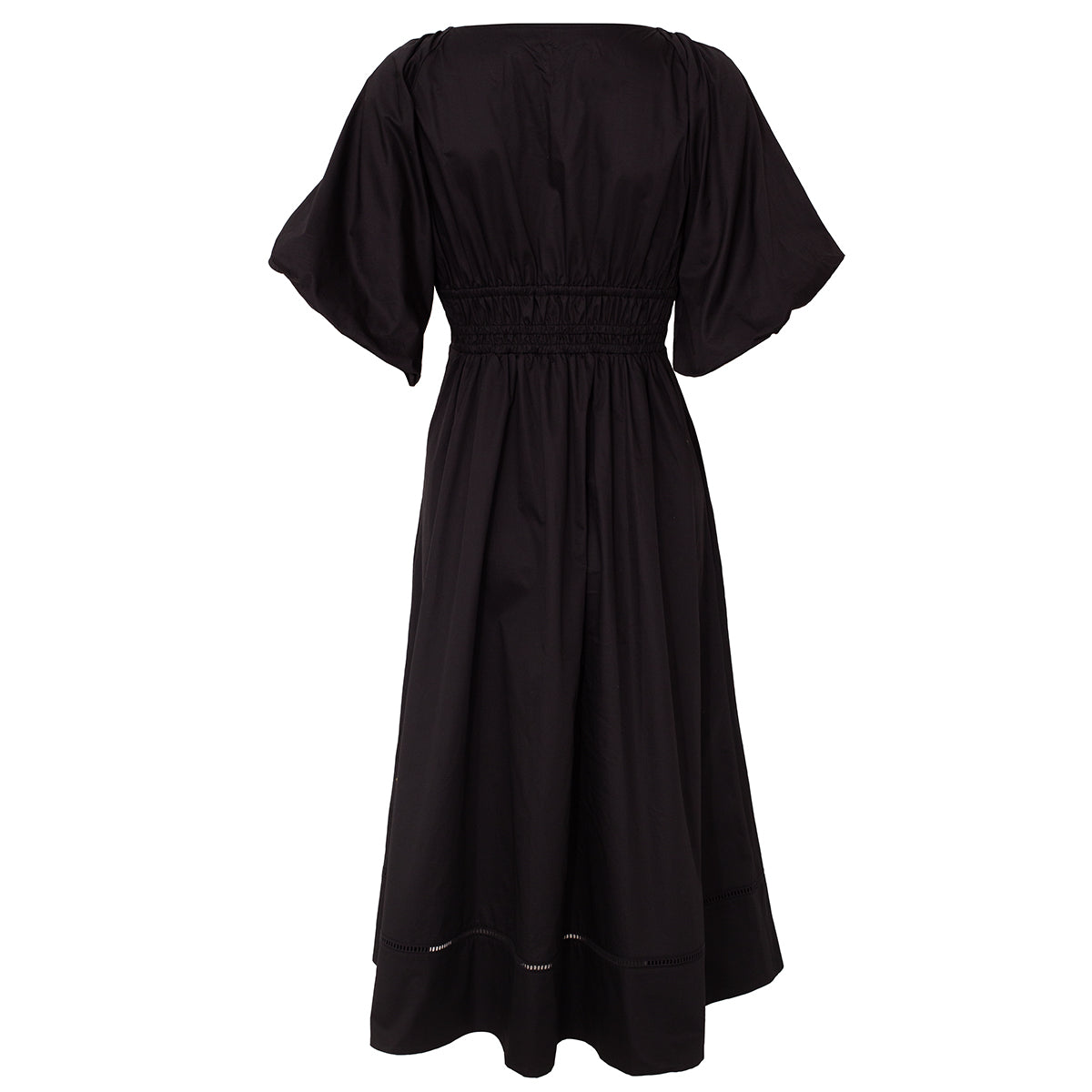 Detalhes: Vestido Tory Burch confeccionada em algodão na cor preta. Modelo possui comprimento longo, decote redondo, mangas curtas bufantes, elástico na cintura, saia ampla, elástico na barra da manga e detalhe em tira transparente no comprimento.