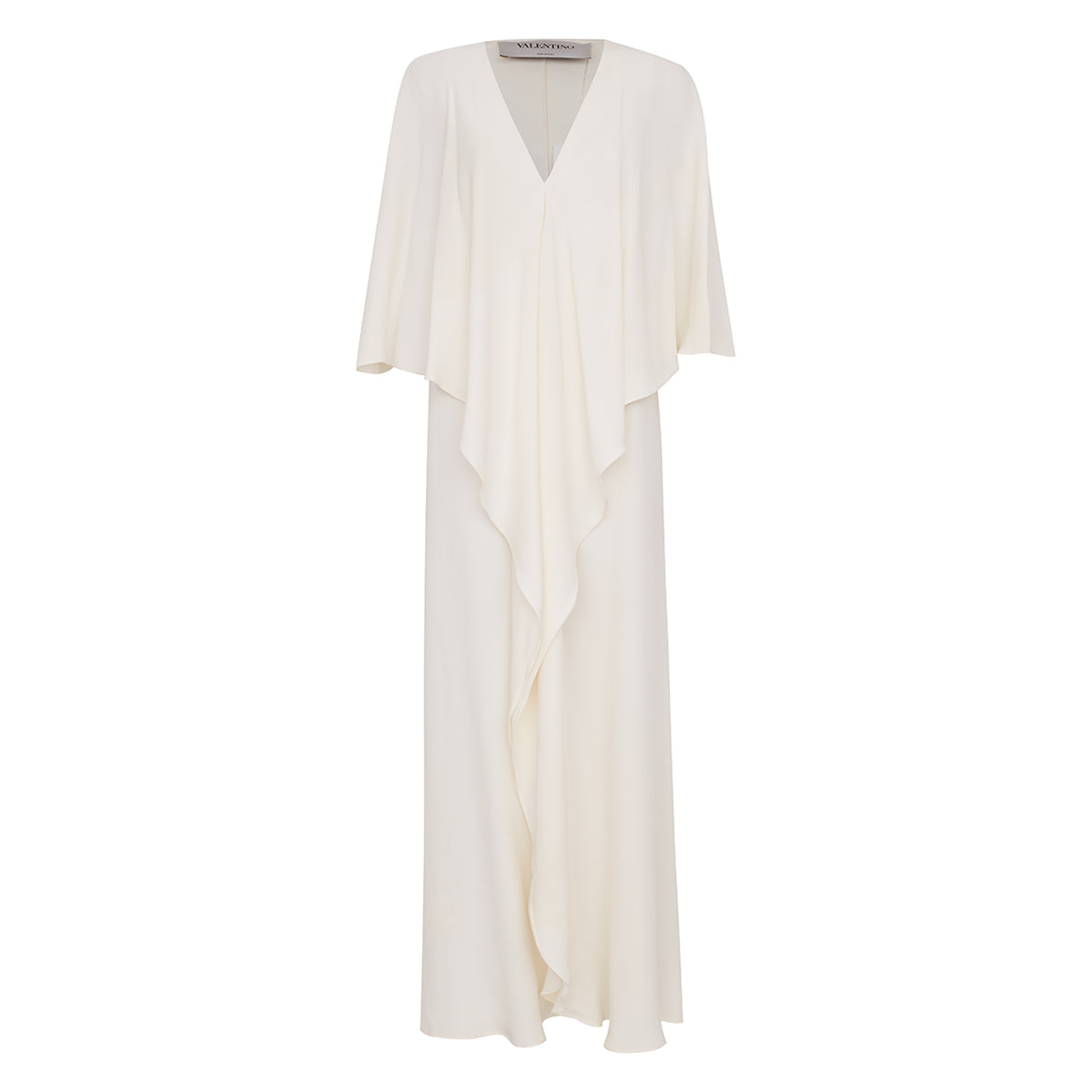 Detalhes: Vestido Valentino confeccionado em seda na cor off white. Modelo possui comprimento longo, mangas curtas, decote V, fenda frontal, capa sobreposta no contorno do busto e babados frontais.
