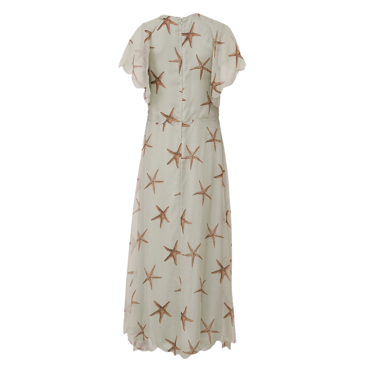 Detalhes: Vestido Valentino confeccionado em tecido verde, estampa de estrelas do mar. O modelo possui comprimento longo, modelagem folgada e fechamento por ciper. Possui mangas de babado.
