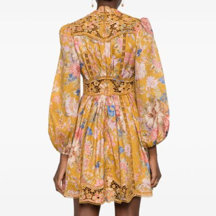 Detalhes: Vestido Zimmerman laranja com estampa floral, modelo que se abre suavemente a partir da cintura em uma saia rodada, e apresenta bordados vazados e transparentes pelo modelo. Possui fechamento por ziper na parte posterior e mangas longas bufantes.