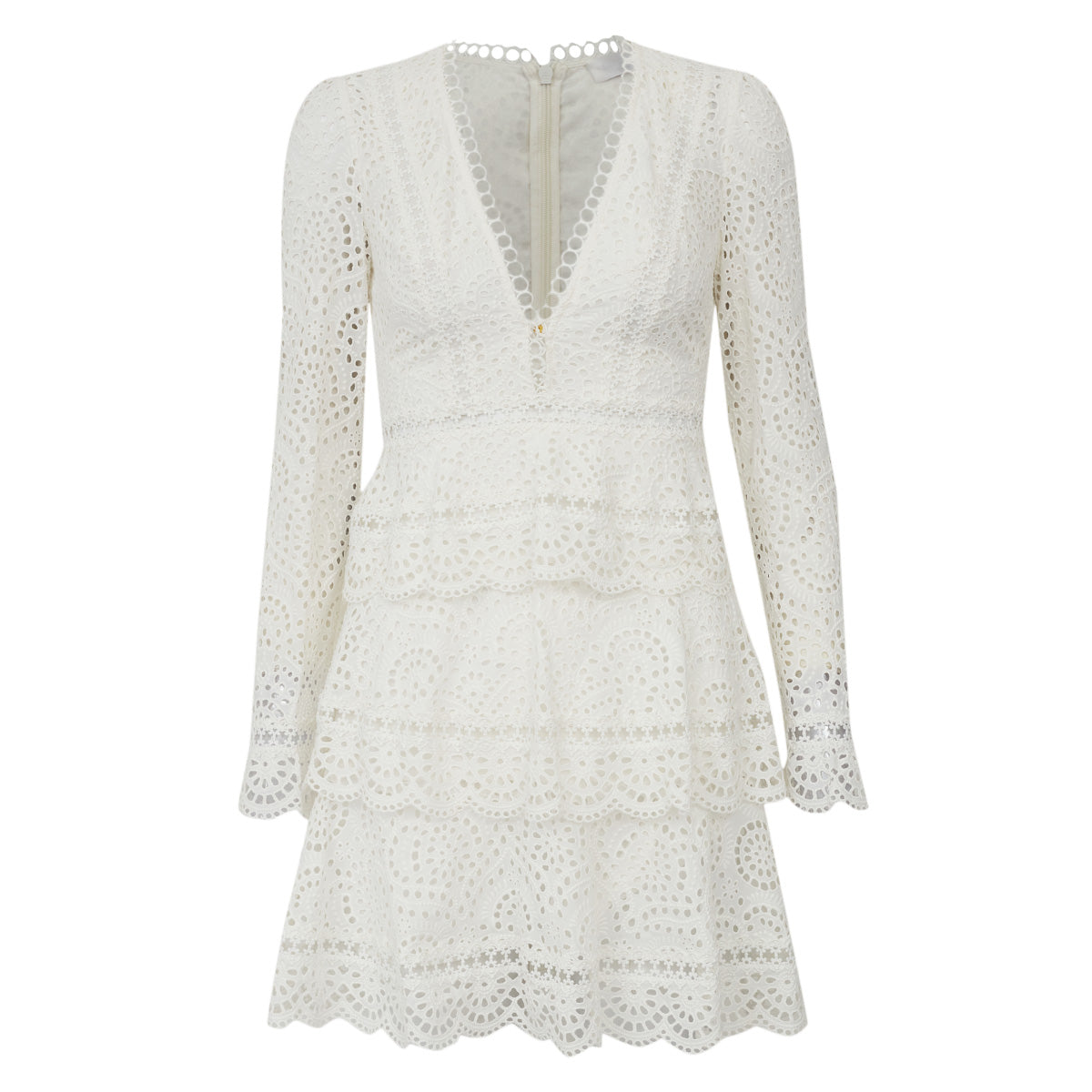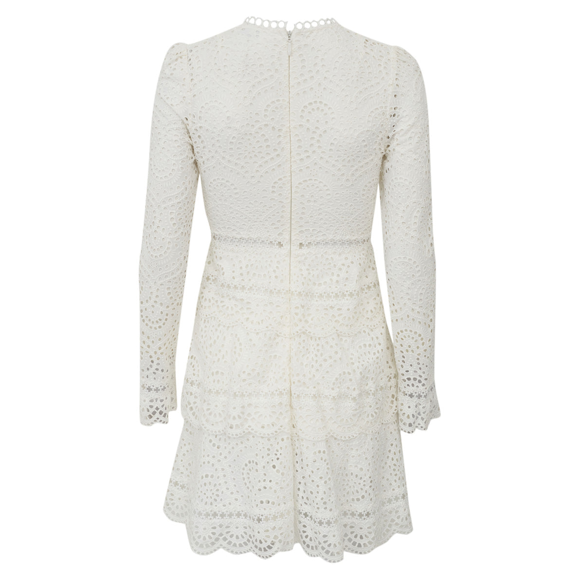 Detalhes: Vestido Zimmermann confeccionado em tecido branco bordado. Possui decote V, comprimento curto, mangas longas, e caimento rodado. Fechamento em zíper na parte posterior.